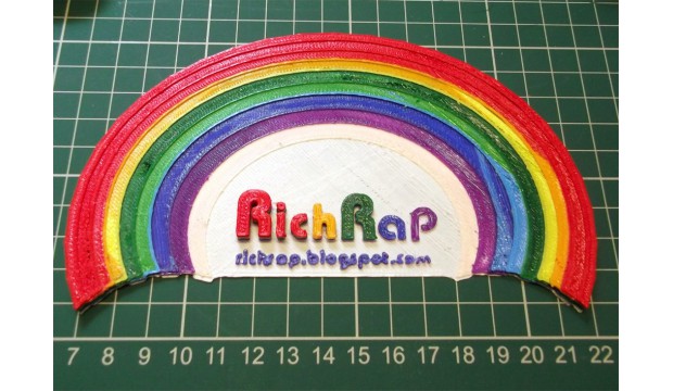 It was not just designed to look pretty as I added lots of sections for filament bridging and thin layers for colour change. Skeinforge finds bridging on curves hard as it decided on an angle for the direction of bridge and does the whole section the same angle, so at points along the curve filament is going straight into the gap, this makes it a hard test especially when done at high speed, that’s why you can see a few gaps and dips in the model surface. I could make it look much better with a different Rainbow design but this was testing how the filament would perform on my Prusa Mendel ‘Bling’ machine.