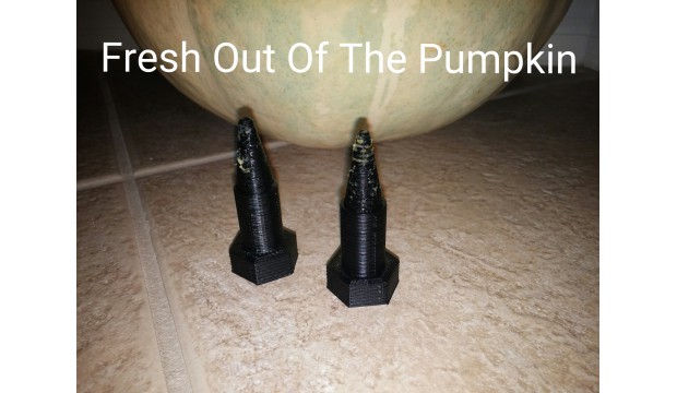 These were printed using ABS and 100% fill. These DID NOT have acetone treatment, the layers for printing aide in the grab and hold in pumpkin when installed. STL file is a single bolt so remember you need to print 2. No tools are needed to install, can you hands to insert into pumpkin. Design is to fully insert conical tip into pumpkin, there is a small taper at this end to help seat a little better. HAVE FUN!!
